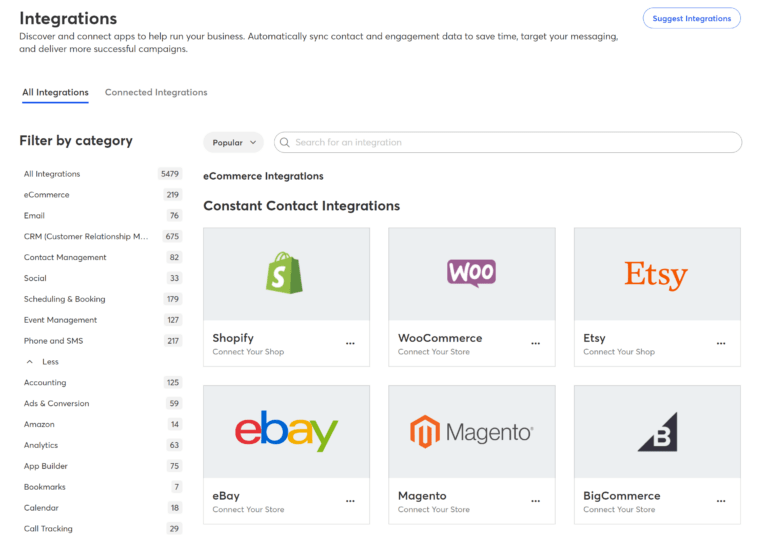 Integrations are easy to find since they can be filtered by category, like CRM, eCommerce, scheduling, and so on. We were particularly impressed with the number of social media integrations the software has.